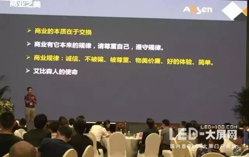 商業(yè)本來(lái)是一件很美的事情,我最近在寫一篇文章叫商業(yè)之美,在我的概念里商業(yè)是很美的,像一個(gè)漂亮的女人穿著一件她特別喜歡的衣服一樣,像一道美味佳肴一樣,很甜美。但是商業(yè)到了我們這里之后,到了中國(guó)的民營(yíng)企業(yè)手里之后,已經(jīng)被糟蹋成什么樣子了?我有個(gè)理想,至少我認(rèn)為艾比森公司在中國(guó)商業(yè)發(fā)展史上要干兩件事情,第一,我們要讓我們的員工感受到幸福,第二,我們要讓艾比森成為一個(gè)標(biāo)桿,去影響和改變這個(gè)糟糕的商業(yè)環(huán)境。