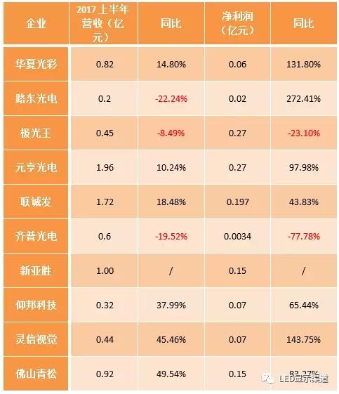 從上面的表格中可以清楚的看到包括led顯示屏周邊配套設(shè)施在內(nèi)的幾家業(yè)內(nèi)新三板企業(yè)2017年上半年總體表現(xiàn),近期得益于海內(nèi)外顯示屏市場的增長,靈信視覺、仰邦科技、元亨光電、聯(lián)誠發(fā)、佛山青松以及華夏光彩營收和凈利潤實現(xiàn)不同程度的增長。然而,齊普光電、極光王卻呈現(xiàn)雙降局面。