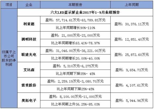 六大LED顯示屏上市公司2017年1-9月業(yè)績(jī)預(yù)告