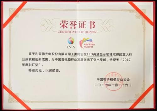 10月26日,2017(第十三屆)中國(guó)音視頻產(chǎn)業(yè)技術(shù)與應(yīng)用趨勢(shì)論壇(AVF)在北京召開(kāi)。本屆論壇以“人工智能風(fēng)口下的突破與創(chuàng)新”為主題,涵蓋國(guó)內(nèi)外音視頻產(chǎn)業(yè)核心技術(shù)、產(chǎn)品、應(yīng)用與新興市場(chǎng)領(lǐng)域。工業(yè)和信息化部等主管部門(mén)領(lǐng)導(dǎo)、中國(guó)電子視像行業(yè)協(xié)會(huì)領(lǐng)導(dǎo),以及國(guó)內(nèi)音視頻產(chǎn)業(yè)鏈上下游企業(yè)高層均出席了會(huì)議,同時(shí)也對(duì)在年內(nèi)取得重大行業(yè)成就、重大技術(shù)創(chuàng)新成果、推動(dòng)產(chǎn)業(yè)快速發(fā)展并取得廣泛影響和突出貢獻(xiàn)的團(tuán)隊(duì)領(lǐng)頭人和企業(yè)品牌進(jìn)行表彰。利亞德集團(tuán)大數(shù)據(jù)可視化綜合應(yīng)用平臺(tái)憑借其在研發(fā)和應(yīng)用上的卓越表現(xiàn)榮獲2017年中國(guó)音視頻產(chǎn)業(yè)人工智能應(yīng)用創(chuàng)新獎(jiǎng)。利亞德產(chǎn)品總監(jiān)王勇先生憑借其在LED高清顯示領(lǐng)域所取得的行業(yè)成就和創(chuàng)新成果榮獲2017年度彩虹獎(jiǎng)。