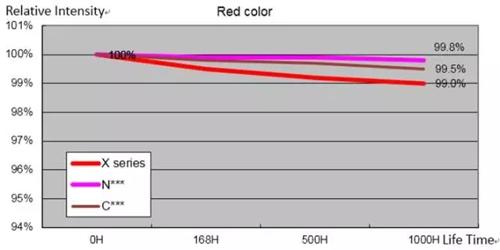 這種艾比森自主研發(fā)的燈珠,紅/綠/藍燈平均亮度為2200mcd/5200mcd/880mcd,而日亞燈的紅/綠/藍平均亮度只有1600mcd/3400mcd/750mcd;同時,A1699相比以往,紅燈亮度提升125%,這意味著消耗同樣功耗的屏體,亮度變得更高。燈在光衰測試中,A1699的表現(xiàn)也非常出色 ,R/G/B的1000小時高溫衰減實驗中顯示為零衰減。