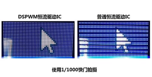 DSPWM恒流驅(qū)動(dòng)IC內(nèi)置消影功能,搭配帶消影的行驅(qū)動(dòng)芯片, 能夠完全消除LED屏“行列拖影”。
