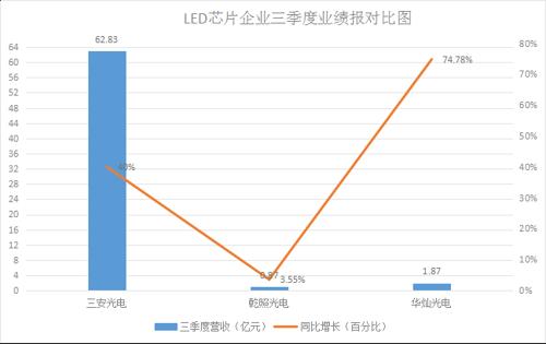 作為LED上游龍頭廠商三安光電名列前茅。數(shù)據(jù)顯示,三安光電前三季營收為62.83億元,同比增長40%;歸屬于上市公司股東的凈利潤為23.78億元,同比增長59%。