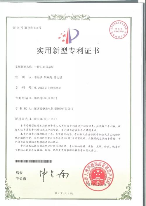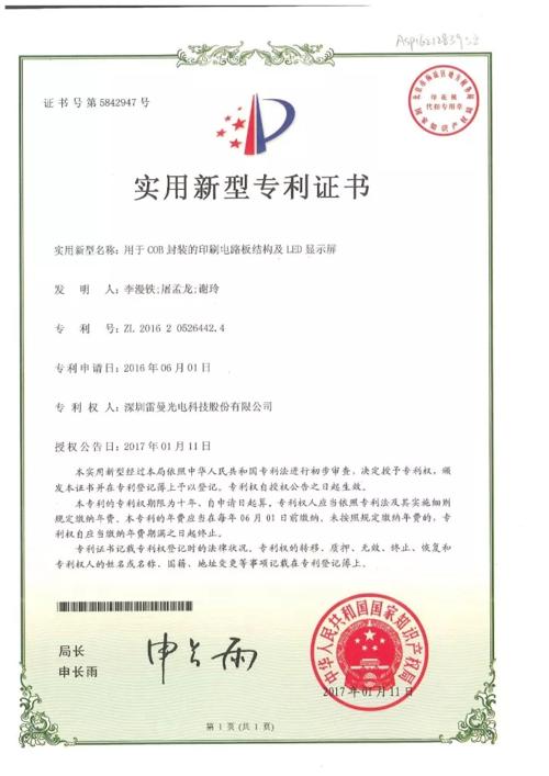 雷曼對COB小間距LED顯示技術(shù)的創(chuàng)新,也通過專利申請,來保護(hù)這些COB小間距顯示技術(shù)的研究成果。到目前為止,雷曼股份已經(jīng)申請了十幾項COB顯示技術(shù)相關(guān)專利,其中《一種led顯示屏》、《LED封裝方法、電路板的制作方法以及顯示屏》等專利,已經(jīng)獲得國家知識產(chǎn)權(quán)局的專利授權(quán)。