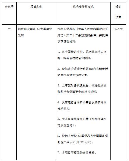 一、采購項(xiàng)目名稱:煙臺(tái)職業(yè)學(xué)院led大屏幕建設(shè)采購