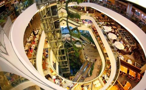 商場前面巨大的玻璃帷幕將商場由高至低包圍起來,使室外大廳看起來十分酷炫。此處每層均植有蔥郁的花草、植物和樹木。在茂密的鋼筋水泥的叢林里遍布著溫室花草,郁郁蔥蔥地一直延伸到附近美麗的公園。