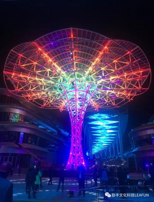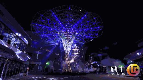 演繹模式,即通過(guò)天幕透明屏結(jié)合20米高,26米寬蟲(chóng)洞進(jìn)行的整體聲光表演,是天文小鎮(zhèn)的核心引爆點(diǎn)。蟲(chóng)洞燈光秀通過(guò)上百臺(tái)的激光燈、光速燈、煙霧機(jī)及全景多聲道音響結(jié)合,在450米的天幕上以五大篇章講述宇宙的形成,表達(dá)人類從宇宙中來(lái),回到宇宙中去的思想主題。