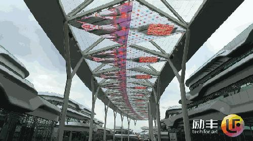 天幕商業(yè)街總長(zhǎng)450米。此次,在LED屏材料選型上,大膽采用總面積超過(guò)3744平方的透明異形屏。異形屏也稱創(chuàng)意屏,它有著比傳統(tǒng)顯示屏更強(qiáng)的視覺(jué)震撼效果,通過(guò)打破傳統(tǒng)規(guī)則形狀的限制,更好地適應(yīng)建筑物的結(jié)構(gòu)與環(huán)境。整個(gè)天幕由多個(gè)等邊菱形拼接而成,整體形成龍之逆鱗效果。