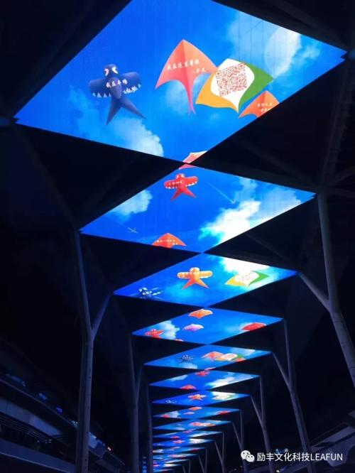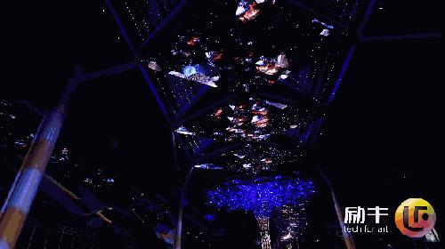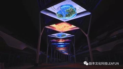 白天,由于透明異形屏具有通透性,游客在觀看影像同時(shí)還能看到藍(lán)天白云。夜幕降臨之時(shí),一場(chǎng)奇幻之旅隨之開(kāi)啟——華麗天幕之上,時(shí)而宇宙浩瀚、群星閃耀,時(shí)而繽紛海底、魚(yú)群穿梭,時(shí)而百花綻放、百鳥(niǎo)齊鳴……抬頭向上看,宛若一條時(shí)光隧道由此打開(kāi)。時(shí)空變幻、光影交錯(cuò)、聲樂(lè)環(huán)繞,猶如觀看科幻大片般。