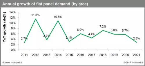 倫敦(2017年11月16日)-- 根據(jù)IHS Markit(納斯達克股票代碼:INFO,一家全球領先的關鍵信息、分析和解決方案供應商)的最新研究分析表明,2018年全球平板顯示器需求預計將比2017年增長7.2%,達2億1千萬平方米。這將是自2014年以來最大的年增長率。