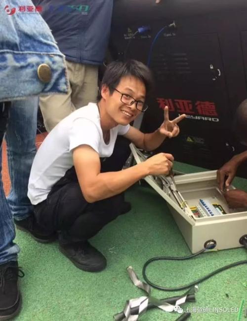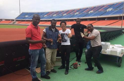 利亞德集團工程師與莫桑比克國家體育場工作人員正在完成藍碩科技全室外球場屏最后調(diào)試。