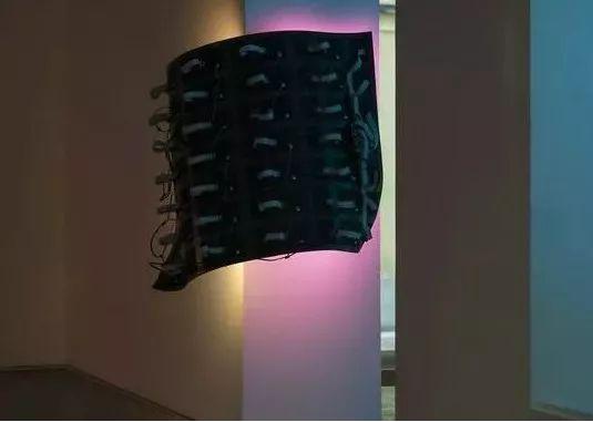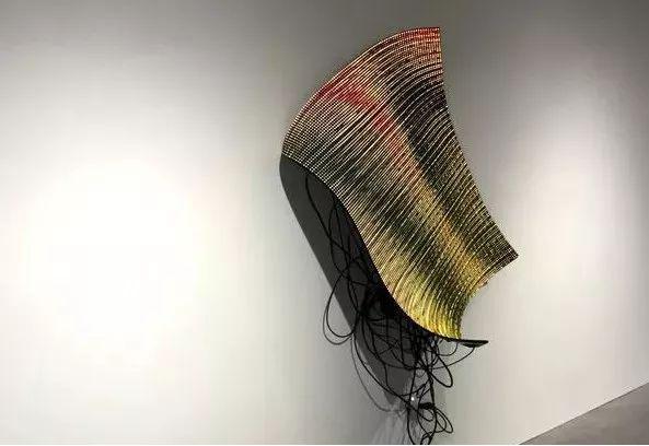 Daniel Canogar將可彎曲的LED粘附于金屬雕塑之上,通過許多像尾巴一樣的線纜連接,從科學(xué)網(wǎng)站上獲取動態(tài)數(shù)據(jù),再經(jīng)過特定的算法,最后將這些內(nèi)容在LED雕塑上以不同區(qū)域的不同顏色展現(xiàn)出來。