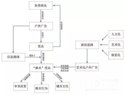 對(duì)于受眾來說,“藝術(shù)化”處理的戶外廣告的形式,會(huì)傳達(dá)出類似于“藝術(shù)品本身”的圖像和視覺信息,給予受眾不同的藝術(shù)語言感受與藝術(shù)符號(hào)的認(rèn)知;受眾在審美的基礎(chǔ)上,得到商業(yè)信息,最終完成認(rèn)同過程。