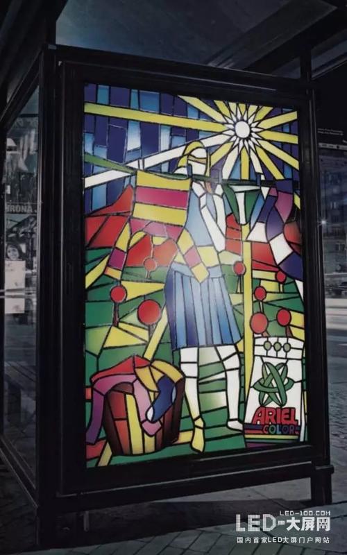 戶外廣告的美感在其面積、色彩、造型、輪廓、材質(zhì)同周圍景觀和諧有序的搭配中才能產(chǎn)生。如(圖6、圖7)國外Ariel Color品牌的洗滌劑廣告,為了突出洗滌劑的優(yōu)異的還原衣服本色的功能,利用染色玻璃作為該品牌洗滌劑的戶外廣告宣傳與設(shè)計(jì)形式,染色玻璃本身的優(yōu)異的色彩觀感與產(chǎn)品的宣傳定位相吻合。通過富有“藝術(shù)化”的戶外廣告宣傳的形式,在廣告牌中對(duì)其加以合理利用,在讓大眾欣賞到具有明快色彩的圖形藝術(shù)的同時(shí),很自然地接受了其所傳達(dá)的商業(yè)信息。