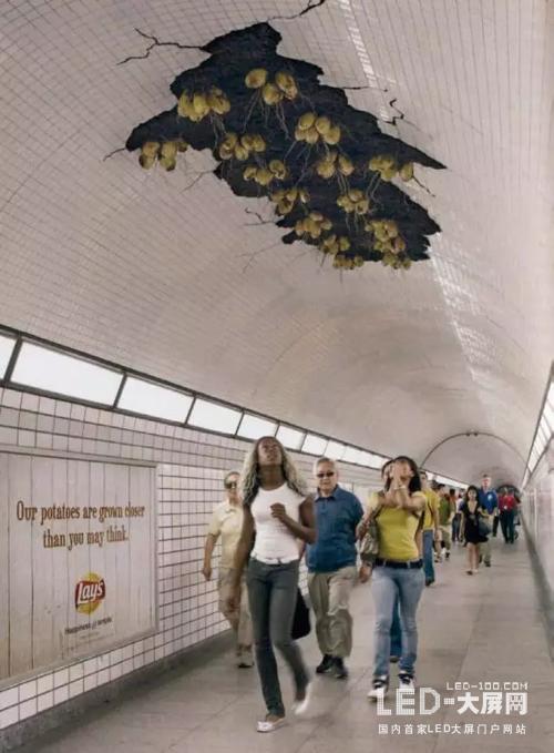 再如美國樂事薯片的《Potatoes Installation》的戶外廣告(圖9),該廣告根據(jù)文案的設(shè)定,進(jìn)行了極具“藝術(shù)化”的構(gòu)思,將戶外廣告本身芝加哥地鐵的屋頂上,通過三維寫實(shí)的處理,仿佛是生長在地鐵里面一樣,達(dá)到“薯片離你很近的”宣傳效果,在與環(huán)境與產(chǎn)品本身相吻合的同時(shí),有機(jī)地將自然環(huán)境納入到戶外廣告的訴求中去。