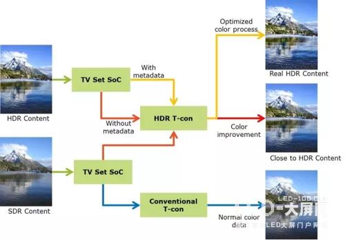隨著HDR的崛起,畫面質(zhì)量越來越重要,但自從2008年起面板廠專注于成本降低而把驅(qū)動(dòng)芯片T-CON的十位元色彩下降到六位元,因?yàn)槟菚r(shí)大多影視內(nèi)容都在HD分辨率,隨著數(shù)位普及化和FHD&UHD分辨率的需求增加,消費(fèi)者對(duì)色彩越來越要求,今天八位元驅(qū)動(dòng)芯片已經(jīng)成為UHD分辨率的基本配備,不然畫面色彩上消費(fèi)一眼就可看出質(zhì)量高低。而隨著HDR+UHD內(nèi)容的影視陸續(xù)稱加,以前的面板硬設(shè)備必須升級(jí)了。所以面板廠近期把HDR的算法加入到驅(qū)動(dòng)芯片里面(當(dāng)然八位元是低標(biāo)配)。如下圖所示,影視內(nèi)容HDR or SDR經(jīng)過SoC視訊處理技術(shù)的基板 (分有記錄影像信號(hào)的靜態(tài)擴(kuò)展信息和沒有處理的基板),在把信號(hào)傳輸?shù)接蠬DR算法的驅(qū)動(dòng)芯片得到不同的畫面效果。