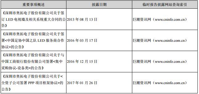 2、《深圳市奧拓電子股份有限公司關(guān)于簽署<中國(guó)足協(xié)中國(guó)之隊(duì)LED服務(wù)商合作協(xié)議>的公告》于2016年3月17日刊登在指定信息披露網(wǎng)站巨潮資訊網(wǎng)。截至2017年3月31日,公司為中國(guó)足協(xié)中國(guó)之隊(duì)54場(chǎng)賽事提供了LED顯示設(shè)備和比賽期間的相關(guān)服務(wù)。