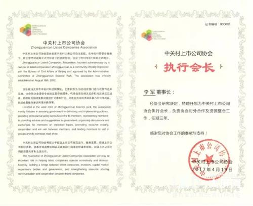 李軍董事長自1998年至2005年連續(xù)兩屆擔任北京市海淀區(qū)政協(xié)委員、2004年至2010年擔任全國青年聯(lián)合會常委、2002年至2006年擔任中國青年企業(yè)家協(xié)會第八屆副會長、2000年至2010年擔任北京中關(guān)村外商投資企業(yè)協(xié)會第四屆理事會副會長。2009年,被中國電子信息產(chǎn)業(yè)發(fā)展研究院評為“2009年中國信息產(chǎn)業(yè)年度經(jīng)濟人物”;被中關(guān)村管委會評為“中關(guān)村20年創(chuàng)新和發(fā)展做出突出貢獻的個人”。2014年被評為“中關(guān)村十大年度人物”。 2016年被福布斯評為“中國上市公司最佳CEO”,并當選為北京創(chuàng)業(yè)板董事長協(xié)會主席。
