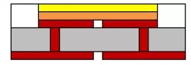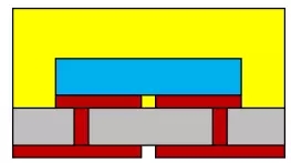 圖一:陶瓷基板+倒裝芯片制造的立體全包裹五面發(fā)光CSPLED(源自深圳大道半導(dǎo)體有限公司,黃色代表熒光膠、藍(lán)色代表倒裝芯片,紅色代表焊墊,灰色代表陶瓷基板)
