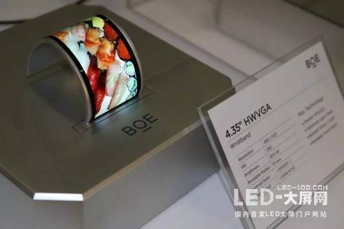 可穿戴設(shè)備也是柔性AMOLED顯示的重要應用領(lǐng)域。BOE(京東方)展出的4.35英寸柔性腕帶顯示產(chǎn)品,是市面上普通腕帶產(chǎn)品尺寸的3倍,彎折半徑為10mm。整體屏幕呈細長狀,展平狀態(tài)下可作為手機使用,彎曲狀態(tài)下可作為腕帶戴在手腕上。該產(chǎn)品可應用于可穿戴手機、可穿戴手環(huán)等對柔性顯示有極高要求的產(chǎn)品。