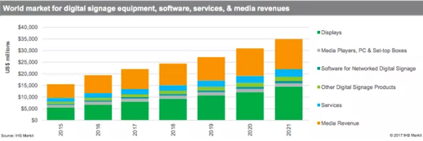 “數(shù)字標牌生態(tài)系統(tǒng)所有渠道在2016年實現(xiàn)了兩位數(shù)的增長,其中,網(wǎng)絡(luò)數(shù)字標牌系統(tǒng)的媒體和軟件收入分別同比增長了32%和24.2%。戶外數(shù)字媒體(DOOH)廣告空間將持續(xù)占據(jù)未來幾年每年收入中的很大部分。2017年,IHS Markit預(yù)計將有更多的顯示器從靜態(tài)轉(zhuǎn)為數(shù)字,尤其是更加經(jīng)濟實惠的戶外led顯示屏!