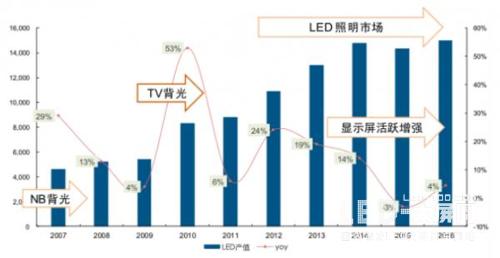 然而從2014年開(kāi)始,背光市場(chǎng)需求暫緩,大尺寸背光市場(chǎng)受到新興OLED顯示技術(shù)的沖擊,筆記本電腦背光滲透也達(dá)到飽和。至此,LED行業(yè)迎來(lái)了成熟期,產(chǎn)值增長(zhǎng)緩慢。