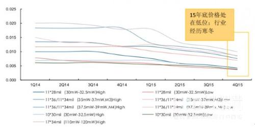 照明作為行業(yè)需求的主要來(lái)源使高速增長(zhǎng)的產(chǎn)能無(wú)法被消化。2014年芯片廠商新增的305臺(tái)MOCVD設(shè)備在15年開(kāi)始產(chǎn)出,致使供求差距拉大,芯片價(jià)格持續(xù)走低。LED芯片廠商在需求頹勢(shì)下,只能采取價(jià)格戰(zhàn)來(lái)獲得市場(chǎng)份額,行業(yè)步入寒冬時(shí)期。