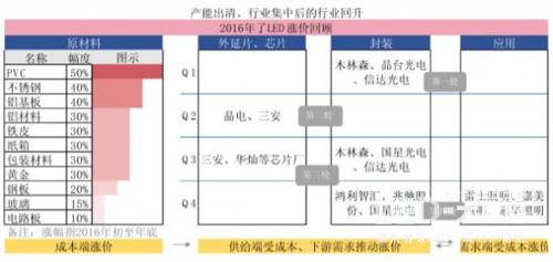 二是供需存異、漲價(jià)浪潮的興起。在芯片價(jià)格持續(xù)低迷、價(jià)格戰(zhàn)壓低LED廠商利潤(rùn)的時(shí)代過(guò)后,從16年一季度開(kāi)始,LED產(chǎn)業(yè)鏈逐級(jí)開(kāi)始漲價(jià)。漲價(jià)的原由主要是成本端原材料成本提升,封裝企業(yè)先行小幅漲價(jià)試水。此后,前端芯片廠商在成本上漲、產(chǎn)能出清、小企淘汰與下游應(yīng)用端需求供給失衡的推動(dòng)下陸續(xù)開(kāi)始對(duì)部分系列產(chǎn)品漲價(jià)10%-20%。