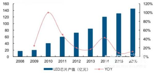 LED(發(fā)光二極管)是一種能將電能轉(zhuǎn)化為光能的半導(dǎo)體器件,具有壽命長(zhǎng)、光效高(達(dá)到80%-90%)、無(wú)輻射、低功耗的特點(diǎn),并且LED的光譜基本集中于可見(jiàn)光頻段,主要應(yīng)用于普通照明、顯示、背光源、裝飾、汽車照明等領(lǐng)域。受下游背光、顯示、照明三大應(yīng)用市場(chǎng)輪番驅(qū)動(dòng)影響,全球LED市場(chǎng)產(chǎn)值呈波段性增長(zhǎng)。在09、10年大尺寸背光火熱了兩年后,LED照明因其節(jié)能環(huán)保、發(fā)光效率高的特點(diǎn)被我國(guó)政府大力推廣,推動(dòng)行業(yè)發(fā)展。在政策支持下,我國(guó)LED照明板塊投資熱潮興起,并且企業(yè)購(gòu)買外延片生產(chǎn)設(shè)備MOCVD受到大額補(bǔ)貼,成為全球LED市場(chǎng)增長(zhǎng)的重要驅(qū)動(dòng)力。