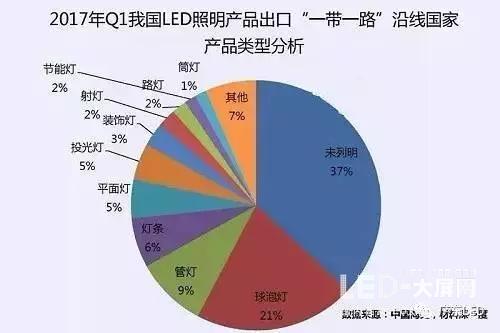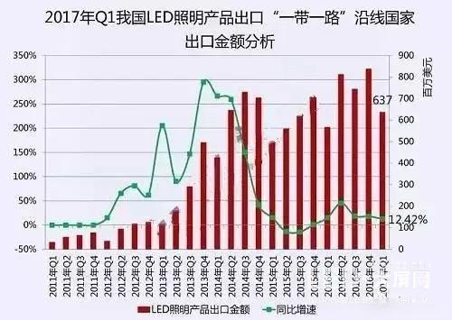 根據(jù)材料深一度統(tǒng)計(jì)分析,2017年一季度,我國LED照明產(chǎn)品出口64個(gè)“一帶一路”沿線64個(gè)國家總金額達(dá)6.37億美元,較2016年同期增長了12.42%,占LED出口市場的24.3%。