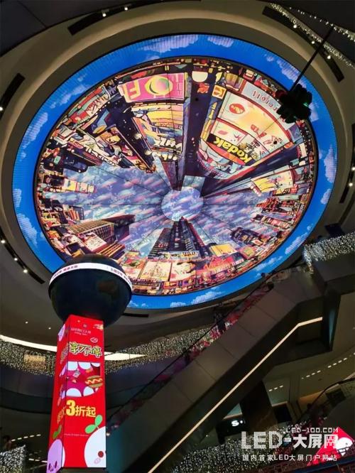 在購物中心上空,一塊圓形結(jié)構(gòu)打造了一幅絢麗的穹頂圓形屏,璀璨奪目。走在下面像是走在美的光里一樣。整個(gè)圓直徑14.34米、面積29.79平方米,屏體共827392個(gè)像素點(diǎn),畫面顯示清晰絢麗。大圓由一個(gè)小圓和環(huán)形帶組成,在播放內(nèi)容時(shí)兩者互相呼應(yīng),呈現(xiàn)出更多的變化。