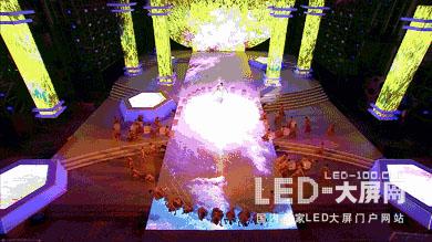 整個(gè)舞臺(tái)視覺呈現(xiàn)由背景巨大LED屏、中間傾斜地屏、兩側(cè)六邊形舞臺(tái)地屏與立面屏、中央升降臺(tái)地屏與立面LED、兩側(cè)各四根LED柱子等組成,此外還根據(jù)節(jié)目靈活架設(shè)巨幅紗幕、可移動(dòng)投影幕等,效果千變?nèi)f化。