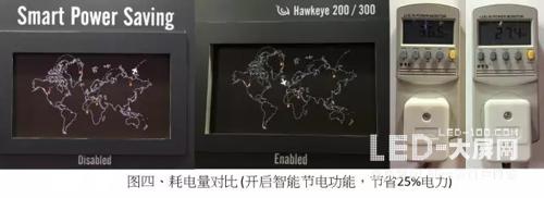 “智能節(jié)電”功能是聚積科技特別針對長時間運作、且顯示畫面多為黑色的led顯示屏應(yīng)用所設(shè)計。聚積展示了兩個led顯示屏箱體,箱體內(nèi)采用的皆是鷹眼200方案 (MBI5353 搭配 MBI5947組合),顯示以黑底為主的地圖,其中一個箱體開啟智能節(jié)電功能,另一個則關(guān)閉,以對比節(jié)電的效果,有開啟節(jié)電功能的箱體明顯節(jié)省了25%的電力。此外,參觀者也能明顯感受到led顯示屏表面的溫度差異。目前僅有鷹眼200與鷹眼300具備智能節(jié)電功能。倘若一面led顯示屏顯示”全黑畫面”時,搭配聚積智能節(jié)電功能的產(chǎn)品,可節(jié)省達到50%的電力。