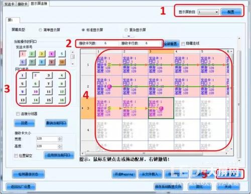 如上圖顯示:在常規(guī)軟件調(diào)試操作中,首先要在熟知現(xiàn)場(chǎng)顯示屏箱體組合排列數(shù)以及接收卡帶點(diǎn)數(shù)后,通過(guò)圖中1-2-3-4-5步驟才能完成顯示屏的調(diào)試工作。