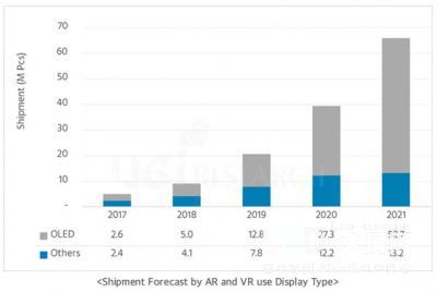 據(jù)UBI,VR和AR市場在OLED及其他技術顯示屏間幾乎形成了1:1的格局,2017年OLED屏出貨260萬臺。大多數(shù)下一代VR頭戴設備將采用OLED屏,到2021年OLED屏將占據(jù)80%的市場份額。
