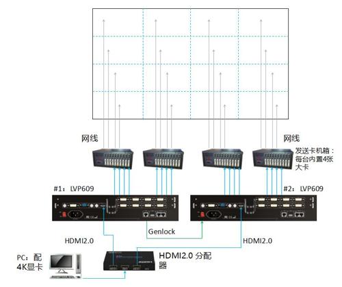 超大分辨率小間距led顯示屏使用4K2K處理器有明顯的優(yōu)勢(shì)。主要體現(xiàn)在兩個(gè)方面:一是放大拼接畫質(zhì)更加清晰;二是點(diǎn)對(duì)點(diǎn)擴(kuò)展拼接操作更簡(jiǎn)單。以分辨率為8K的顯示屏為例,使用普通處理器2K輸入寬高需要分別放大4倍,而采用4K處理器輸入4K信號(hào)輸出畫面寬高僅需放大2倍,放大倍數(shù)更小,畫質(zhì)更加清晰;而8K顯示屏點(diǎn)對(duì)點(diǎn)顯示,采用多臺(tái)4K2K處理器做擴(kuò)展拼接比使用2K方案省去更多融合、拼接等繁冗步驟,從方案實(shí)現(xiàn)和設(shè)置方面均更加簡(jiǎn)單便捷。今天我們來介紹使用LVP609多機(jī)級(jí)聯(lián)分別來實(shí)現(xiàn)8K(7680x4320)放大拼接和點(diǎn)對(duì)點(diǎn)顯示的方案。