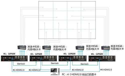 項(xiàng)目要求:一塊超大LED屏,分辨率7680*4320點(diǎn),要求顯示完整的4K2K輸入信號(hào)畫面;LED屏水平分4部分,垂直分4部分,總16塊拼接,每塊分辨率1920*1080點(diǎn)。