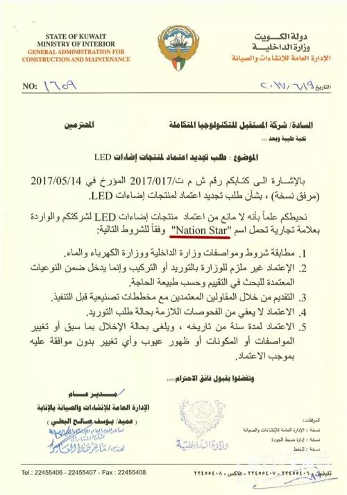 日前,國(guó)星海外市場(chǎng)傳來好消息:經(jīng)過兩年多的品牌培育和市場(chǎng)耕耘,國(guó)星光電旗下的NationStar品牌成為科威特內(nèi)政部、教育部和水利電力部聯(lián)合推薦的燈具品牌。國(guó)星NaionStar也成為科威特財(cái)政部燈管改造項(xiàng)目的唯一指定供應(yīng)商。