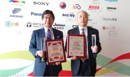 索尼中國專業(yè)系統(tǒng)集團(tuán)總裁井手司治、技術(shù)總監(jiān)王亞明上臺領(lǐng)取了獎杯和證書。