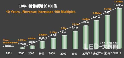 作為led顯示屏行業(yè)的傳奇之一,艾比森曾創(chuàng)下10年銷售額增長100倍的紀錄,率先在行業(yè)內(nèi)突破10億大關(guān),曾達成了六個“第一”——顯示屏行業(yè)銷售第一、行業(yè)出口第一、顯示屏行業(yè)利潤第一、行業(yè)現(xiàn)金流第一和行業(yè)周轉(zhuǎn)率第一。