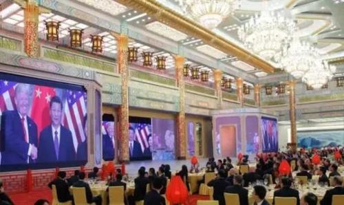 北京人民大會(huì)堂金色大廳金碧輝煌,高朋滿(mǎn)座,LED高清屏幕上回放著“習(xí)特會(huì)”的經(jīng)典畫(huà)面。特朗普現(xiàn)場(chǎng)提議播放他外孫女用中文演唱中國(guó)歌曲、背誦《三字經(jīng)》和中國(guó)古詩(shī)的視頻,現(xiàn)場(chǎng)一再響起熱烈掌聲。