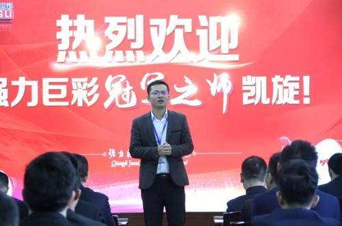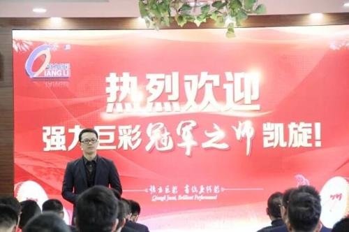接著,載譽(yù)榮歸的冠軍之師迅速列隊(duì)整齊以待,強(qiáng)力巨彩董事長朱志強(qiáng)先生、營銷事業(yè)部代理總經(jīng)理?xiàng)铠欃F先生以及各中心負(fù)責(zé)人親臨迎接,舉辦了隆重的歡迎儀式。