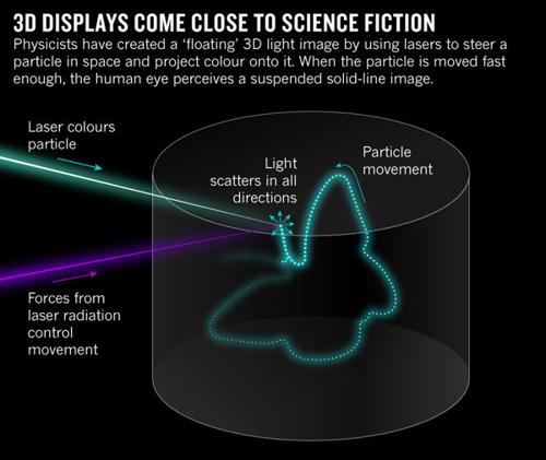 這種技術(shù)的原理就像是高度版本的Etch a Sketch應用:通過一組由近似不可見的激光束所呈現(xiàn)的作用力來捕獲名為纖維素的植物纖維的單個顆粒,并且不均勻地將其加熱。這樣,研究人員就可以推拉纖維素。第二組激光則把可見光(紅色,綠色和藍色)投影至粒子上,照亮在空間中移動的粒子。人類無法通過比每秒10次更快的速度來辨別圖像,所以如果粒子的移動速度足夠快,它的軌跡就會如同一條實線,就像在黑暗中移動的煙火一樣。如果圖像的變化速度夠快,它看起來就會像是在移動。顯示圖像可以疊加在真實的對象上,這樣用戶就能在真實空間中環(huán)繞其走動。