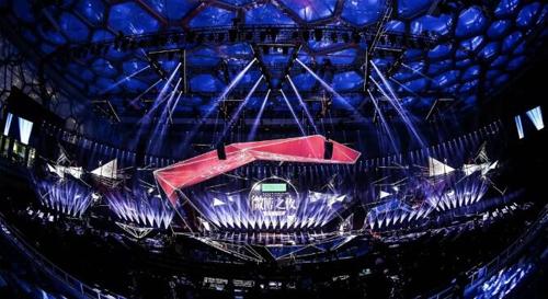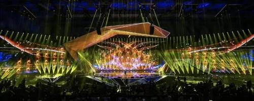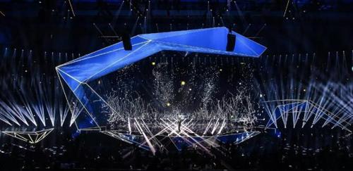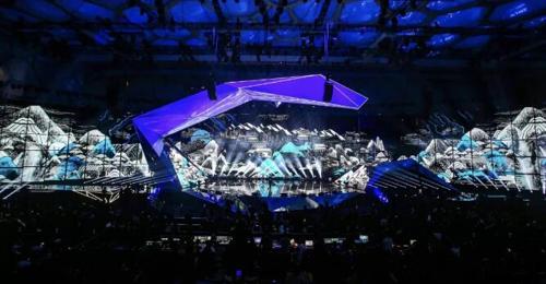 搭建在水立方泳池上的舞臺,以水晶切割面形成的“C”形半包圍式立體造型裝飾舞臺。這個造型連起了地面屏、兩側傾斜向前的LED。可發(fā)光部分呼應于舞臺表演、燈光、影像,幾面鏡面材質反射現(xiàn)場環(huán)境。恩維傳媒舞臺視覺設計師就是依據(jù)整個舞臺造型進行視覺畫面的整體設計。