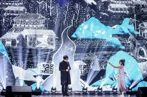 板畫式的遼闊山水畫卷從地屏到背景全面展開,用畫面表達歌詞情緒。