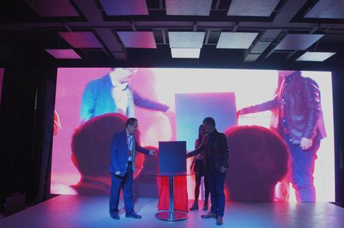 發(fā)布會(huì)伊始,led顯示屏流光溢彩,畫(huà)面被賦予新生命,現(xiàn)場(chǎng)視覺(jué)動(dòng)感十足。在全場(chǎng)翹首期盼中,楊總和胡總共同掀起紅布,揭開(kāi)新品的神秘面紗,E系列閃耀亮相。易事達(dá)屏模郭春娜旋轉(zhuǎn)展示產(chǎn)品,開(kāi)啟了一場(chǎng)“黃金視覺(jué),看?真彩視界”的探索之旅。