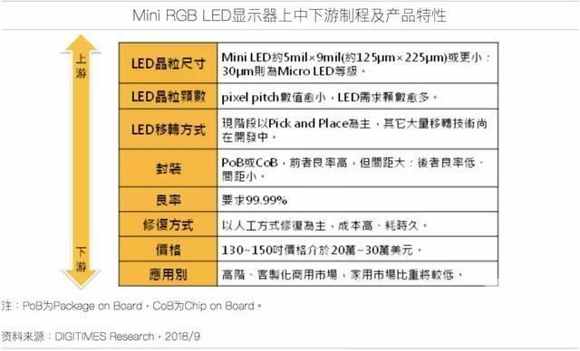 雖Mini RGB LED顯示器已達量產(chǎn)及商品化階段,然與背光用Mini LED相較,制作難度甚高,故定位在高階市場、屬客制化產(chǎn)品,售價頗高。以LED晶粒尺寸來看,顯示器用Mini LED要求5mil×9mil(約125μm×225μm)(含)以下,并以三原色組成,相對的,背光應用以單色藍光為主,晶粒尺寸稍大;另,Mini LED顯示器基礎良率為4個9 (99.99%),亦較背光應用的要求嚴格。