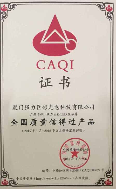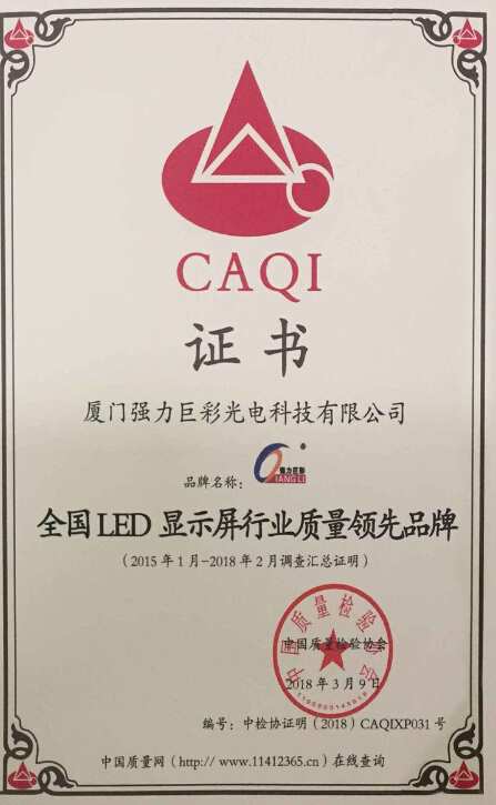 作為中國(guó)光學(xué)光電子行業(yè)協(xié)會(huì)、福建省及廈門市光電協(xié)會(huì)會(huì)員和廈門市高新技術(shù)協(xié)會(huì)常務(wù)理事單位,強(qiáng)力巨彩獲得了2011-2012年度十佳LED顯示應(yīng)用工程、中國(guó)LED行業(yè)十強(qiáng)企業(yè)、2012年度廈門市最具成長(zhǎng)性企業(yè)、節(jié)能減排優(yōu)秀企業(yè)、納稅明星企業(yè)以及安全生產(chǎn)先進(jìn)單位和國(guó)家火炬項(xiàng)目證書等多項(xiàng)榮譽(yù)稱號(hào)。另外,強(qiáng)力巨彩先后通過了OHSAS18000、ISO14000、ISO9000認(rèn)證。產(chǎn)品獲得CE、RoHS和CCC等認(rèn)證,并獲得了室內(nèi)、戶外多項(xiàng)產(chǎn)品專利。