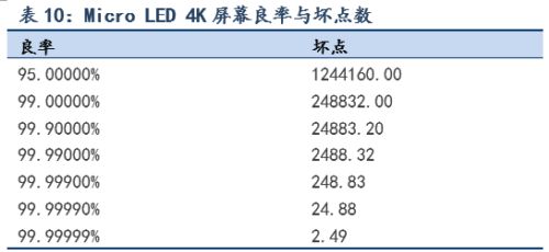 此外,千萬級(jí)的RGB像素也給轉(zhuǎn)移過程中的良率控制帶來了很大的挑戰(zhàn)。仍以4K屏幕為例,為了將壞點(diǎn)控制在兩位數(shù)以內(nèi),轉(zhuǎn)移的良率需要提高到99.9999%,這就需要Micro LED制程的設(shè)備的精密度需降到±0.5μm。但目前現(xiàn)況轉(zhuǎn)移設(shè)備(Pick & Place)的精密度是±34μm (Multi-chipper Transfer),覆晶固晶機(jī)(Flip Chip Bonder)的精密度是±1.5μm (每次移轉(zhuǎn)為單一芯片) ,皆無法達(dá)到Micro LED巨量轉(zhuǎn)移的精密度規(guī)格需求。