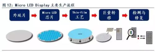 Micro LED主要生產(chǎn)工藝主要包括外延片生產(chǎn)、芯片制造、Thin-film工藝、巨量轉(zhuǎn)移、檢測(cè)與修復(fù)。其中,外延片生產(chǎn)、Micro LED芯片制造、Thin-film工藝跟傳統(tǒng)的LED生產(chǎn)比較相似,企業(yè)只需對(duì)設(shè)備稍加改造就可用于Micro LED制造環(huán)節(jié)。目前的制造難點(diǎn)主要集中在巨量轉(zhuǎn)移、檢測(cè)與修復(fù)方面以及驅(qū)動(dòng)IC的設(shè)計(jì)和工藝上。